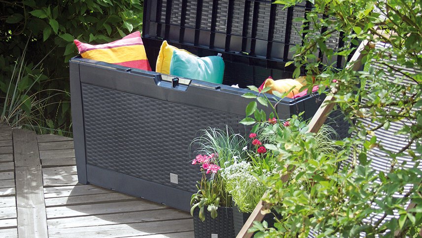 Ein Trampolin bereitet kleinen und auch großen Abenteurern Freude. Andere wiederum können am besten im Liegestuhl mit einem Buch oder Getränk abschalten und dem Alltag entfliehen. Um Ordnung im Garten zu halten und Sitzpolster oder kleinere Gegenstände sicher aufzubewahren, empfiehlt sich eine verlässliche Allzwecktruhe.