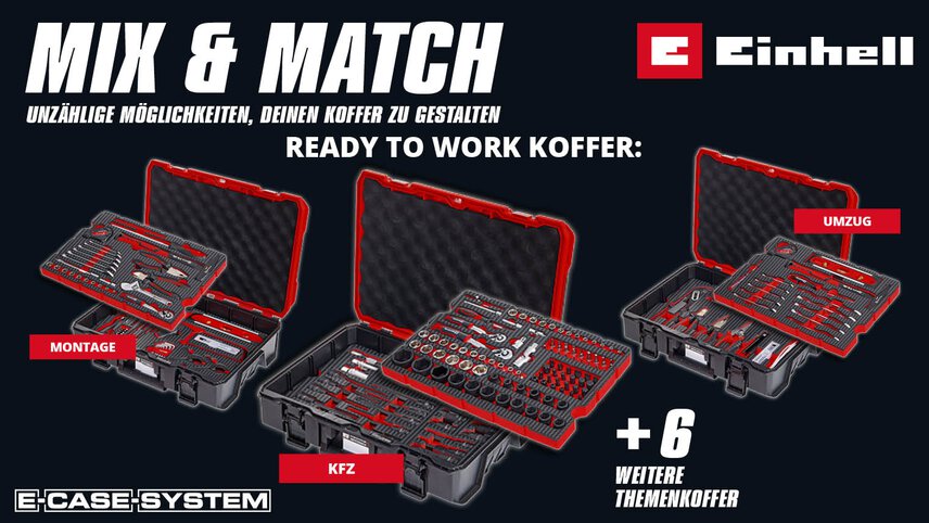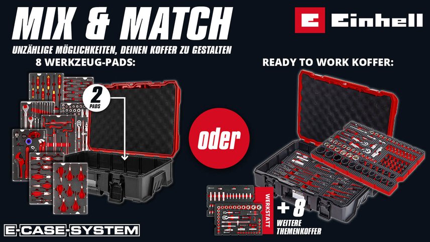 Schluss mit Werkzeugchaos. Das neue EINHELL E-Case Mix & Match System bringt echte Flexibilität in Ihre Werkzeugorganisation: Greifen Sie zu einem fertig bestückten Ready-to-Work-Koffer und starten Sie direkt oder stellen Sie sich mit dem Mix & Match Prinzip Ihren persönlichen Werkzeugkoffer aus zwei Einlegern zusammen.