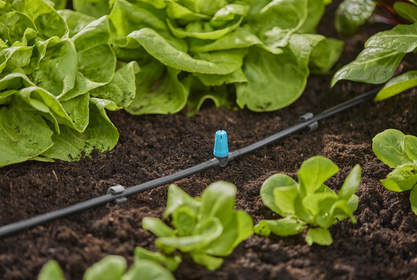 Die Kleinflächendüse von GARDENA dient zur gezielten Bewässerung von Kleinflächen mit Salaten und Setzlingen oder Blumenbeeten. Der Beregnungsradius der Micro-Drip-System-Komponente wird vor der Bewässerung individuell zwischen 10 und 40 cm eingestellt und passt sich somit flexible an die Pflanzen an. Dadurch ist die Kleinflächendüse sehr gut für wachsende Pflanzen geeignet, die eine unterschiedliche Sprühweite erfordern. Durch die clevere Easy & Flexible Verbindungstechnik mit Stecksystem ist die Installation der Kleinflächendüse an ein 4,6-mm-Verteilerrohr komfortabel und einfach und kann auch jederzeit flexibel umgebaut werden. Die enthaltene Reinigungsnadel ist ideal zum Lösen von eventuellen Verstopfungen der Düse geeignet.