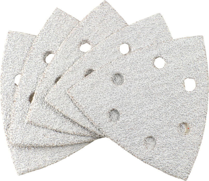 Das gelochte kwb QUICK-STICK Silberschliff Schleifdreieck für Deltaschleifer verfügt über eine Velours-Rückseite zur Befestigung auf Haftstütztellern mit Kletthaftbelag. Die Körnung der verstärkten, vollkunstharzgebundenen Schleifscheibe besteht aus Korund mit Stearat Beschichtung. Das Stearat reduziert das Zusetzen der Körnung. Das Schleifmittel eignet sich ideal zum Schleifen von Hart- und Weichholz, Kunstharzlack, Acryllack, Farbe und Kunststoff.