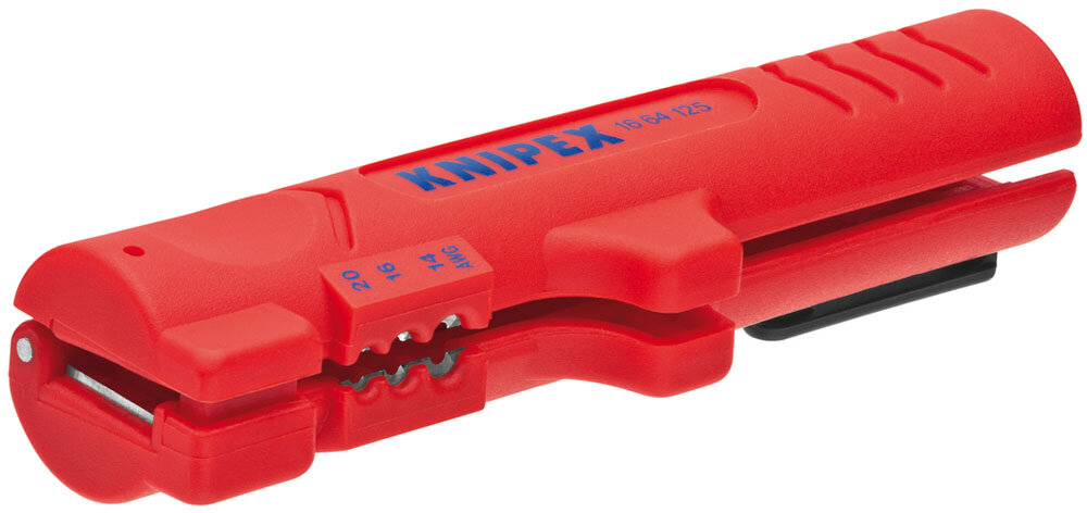 für Flachkabel bis 12 mm Breite, zum Abmanteln und Abisolieren aller gängigen Rund- und Feuchtraumkabel von 4 - 13 mm Ø, Abisoliervorrichtung für die Querschnitte 0,8 / 1,5 und 2,5 mm², ideal für Arbeiten an engen und schwer zugänglichen Arbeitsbereichen, auch zum Einsatz in Abzweig- und Verteilerdosen, mit Öffnungsfeder und Sperrklinke