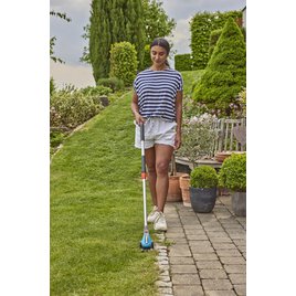 Das Akku-Grasschere ClassicCut Li Set von GARDENA eignet sich für das präzise Schneiden von Rasenkanten und bringt kleine Sträucher wie einen Buchs in Form. Das Set beinhaltet ein 8 cm breites Grasmesser, Laufräder und einen Teleskopstiel. Dank der präzisionsgeschliffenen, antihaftbeschichteten Klinge mit einer langanhaltenden Schärfe werden saubere und exakte Schnitte ermöglicht. Das Grasmesser überzeugt mit hoher Qualität Made in Germany. Für eine komfortable Handhabung und angenehme Führung sorgt der ergonomische Griff. Der Teleskopstiel verfügt ebenfalls über einen ergonomischen Griff und ist flexibel höhenverstellbar zwischen 74 und 96 cm. Kombiniert mit den Laufrädern geht das Arbeiten in aufrechter Körperhaltung noch leichter von der Hand. Ein voller Akku hält 50 Minuten lang, bevor er mit Hilfe des enthaltenen USB-C-Kabels aufgeladen wird. Durch die LED-Anzeige ist der Batteriestatus immer im Blick. Ein Knopfdruck an der Seite des Gehäuses reicht aus, um das Messer zu lösen und entfernen zu können. Die Akku-Grasschere kann mit dem separat erhältlichen Strauchmesser (Art.-Nr. 9863-20) zur Strauchschere umgerüstet werden.