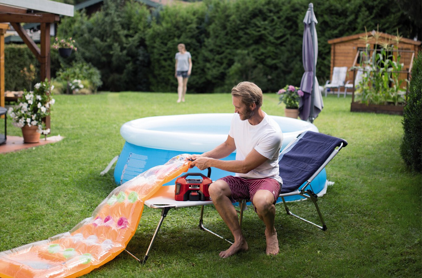 Dem Einhell Akku-Kompressor Pressito 18/21 geht die Luft nie aus. Ob Pumpen oder Entlüften, die Einsatzmöglichkeiten sind vielfältig. Der Kompressor ist Mitglied der Power X-Change-Familie: Der PXC-Akku lässt sich in allen Geräten der Systemfamilie verwenden. Dank seiner Hochdruckpumpe eignet sich der Kompressor zum Aufpumpen von Autoreifen, Radreifen und Bällen, seine Niederdruckpumpe dagegen zum Befüllen von Luftmatratzen, beim Niederdrucksaugen lassen sich diese wieder entlüften. Der Kompressor ist ausgestattet mit einer digitalen Druckanzeige mit einfacher manueller Bedienung, wählbare Einheiten für den Druck sind Bar, PSI und kPa. Der gewünschte Druck kann bei der Hochdruckpumpe eingestellt werden. Zu den praktischen Features gehören die Auto Shutoff-Funktion bei Erreichen des eingestellten Drucks und ein Tastschalter zum Aufpumpen im Hochdruckbereich ohne Druckvoreinstellung. Ausgestattet ist der Akku-Kompressor mit einem Aufbewahrungsfach für das 3-teilige Adapter-Set.
