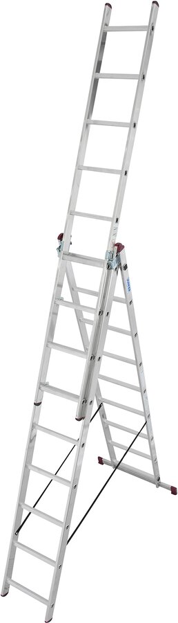 3 x 9 Sprossen, Vierkant-Profil, profiliert, zusätzlicher Querfuß bietet absolut sicheren Stand, rutschfeste 2-Komponenten-Fußkappen, Bandsicherung, TÜV-/GS-geprüft nach EN 131, Länge / Arbeitshöhe der Anlegeleiter: 1-fach ca. 2,50 m (3,75 m), 2-fach ca. 3,75 m (4,55 m), 3-fach ca. 5,30 m (6,20 m)