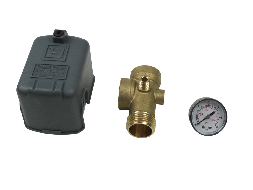 Inhalt: Druckschalter, Manometer und 5-Wegstück