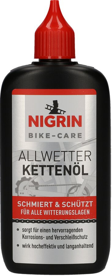 NIGRIN Bike-Care Allwetter Kettenöl ist ein Hochleistungs-Schmierstoff, der die Reibung lang anhaltend verringert. Sorgt für einen hervorragenden Korrosions- und Verschleißschutz Wirkt hocheffektiv und langanhaltend