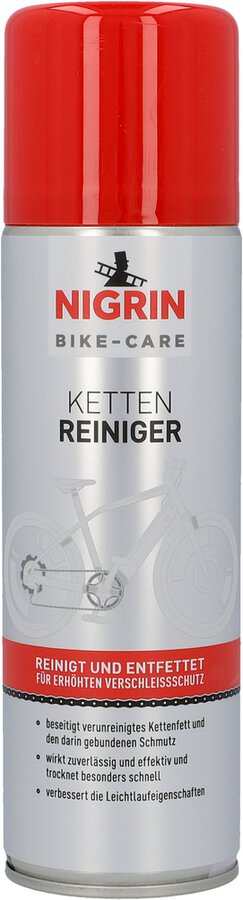 NIGRIN Kettenreiniger für Fahrradketten Mit diesem Kettenreiniger können Sie Ihre Fahrradkette schnell und effektiv reinigen und somit ihre Lebensdauer verlängern. In dem Kettenfett werden Schmutz- und Staubpartikel eingeschlossen, die mit der Zeit die Funktionsfähigkeit der Kette belasten. Der NIGRIN Ketten-Reiniger ist unentbehrlich für die regelmäßige Pflege von Fahrrad-Antriebsketten. Das Kettenspray beugt vorzeitigem Verschleiß durch Verschmutzung vor. Der NIGRIN Kettenreiniger beseitigt verunreinigtes Kettenfett und den darin gebundenen Schmutz, wodurch er auch die Leichtlaufeigenschaften verbessert.