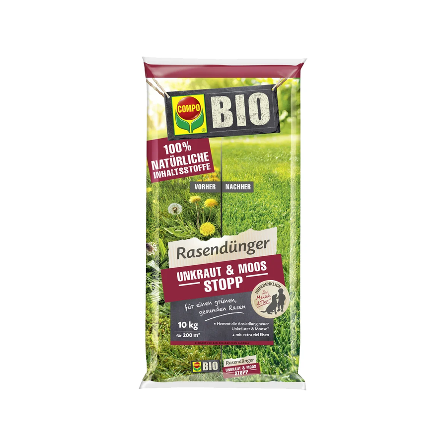 Moos & Unkraut von Anfang an bekämpfen. COMPO Rasendünger Unkraut & Moos Stopp für einen grünen und kräftigen Rasen. Wirksame, biologische Inhaltsstoffe entziehen Unkrautsamen die Wachstumsgrundlage. Wirkt vorbeugend gegen Moos und Unkraut und vorhandenes Gras wird gestärkt. Dieser Rasendünger ist für den biologischen Landbau geeignet und besteht aus 100% natürlichen Inhaltsstoffen.