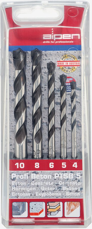 robuste Hochleistungsbohrer zum Schlag- und Drehbohren, noch längere Standzeit durch moderne Vakuumhärtung, Inhalt:je 1 Stk. 4 / 5 / 6 / 8 und 10 mm Ø