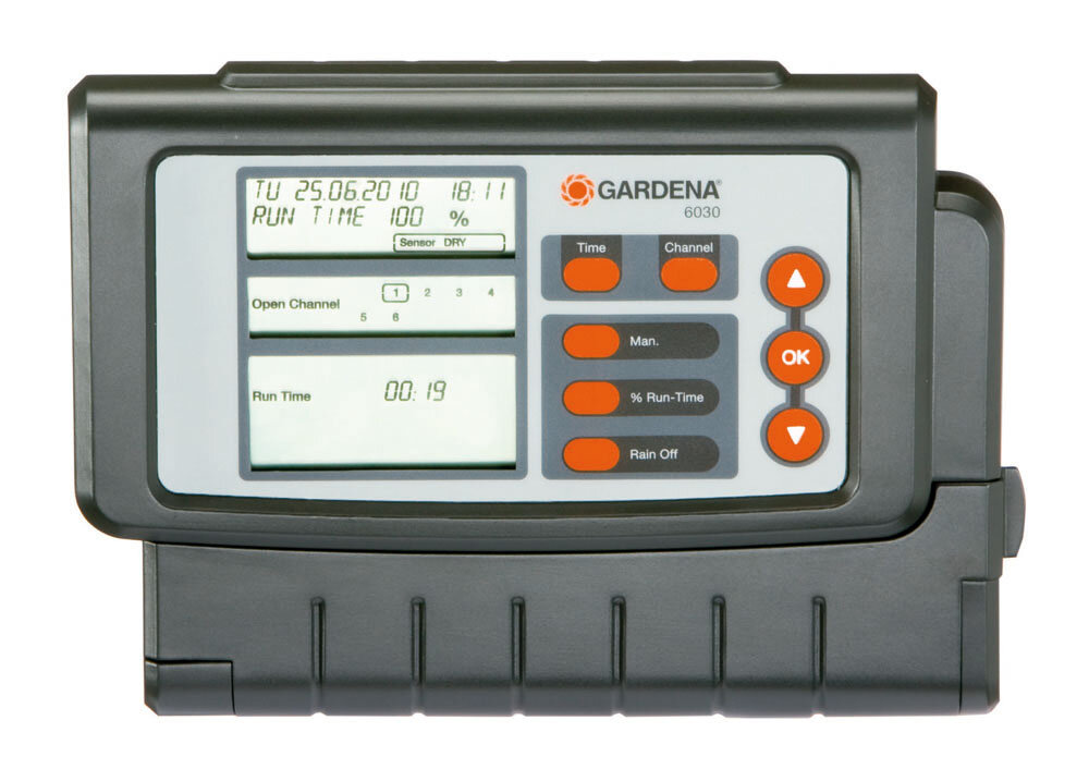 zur Steuerung von bis zu 6 Bewässerungsventilen 24 V, Kabelverbindung zu den Ventilen, bis zu 3 unabhängige Programme pro Bewässerungsventil, Bewässerungsdauer zentral von 10 - 200 % veränderbar, Masterkanal zur Ansteuerung einer Pumpe, im Innen- und regengeschützten Außenbereich einsetzbar, Netzausfallsicherung durch 9 V-Batterie