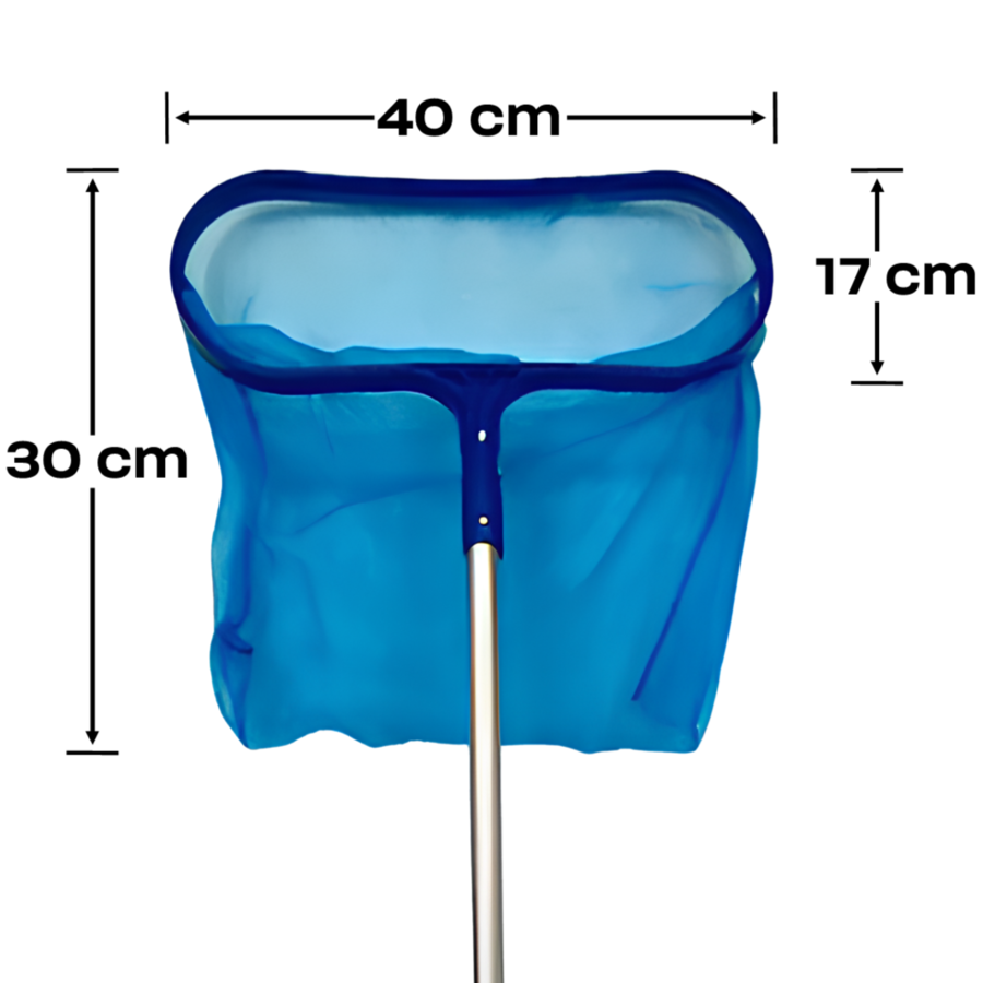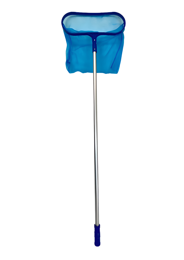 Bodenkescher mit Alu-Stange 1,5 m lang. Zum Entfernen von Schmutzpartikeln auf dem Pool- oder Whirlpoolboden. Breite des Keschers = 40 cm, Tiefe des Keschers = 30 cm.