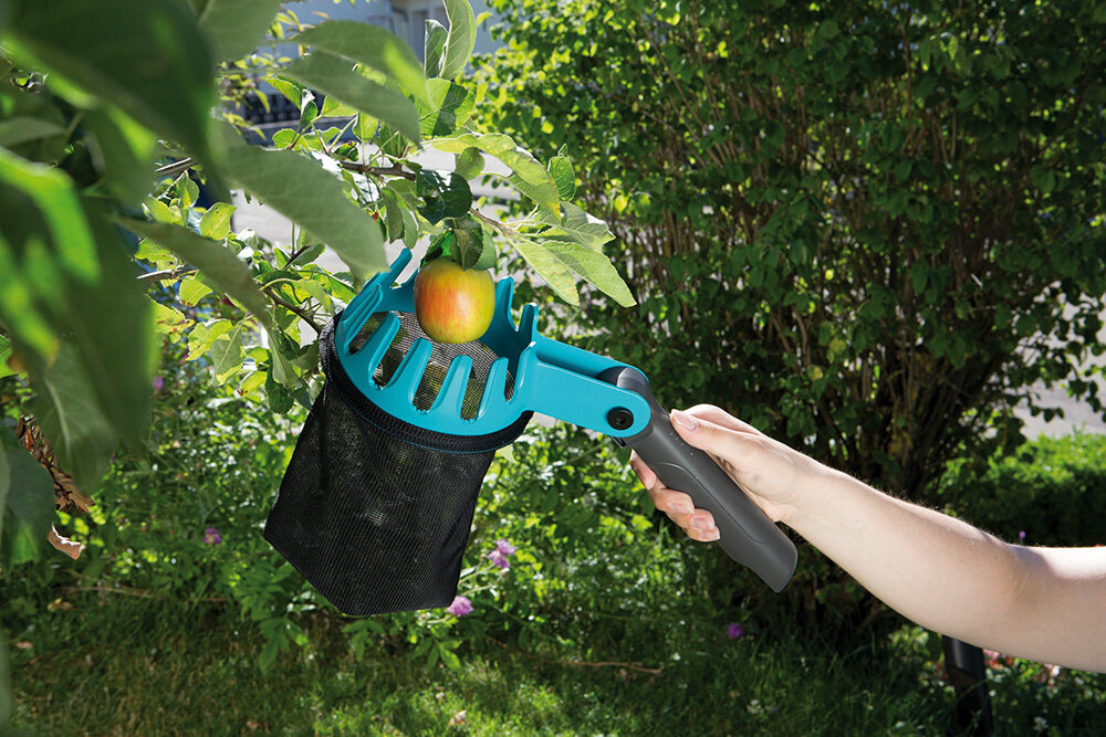 Zähne zwischen den Öffnungen zum leichten Pflücken, individuelle Einstellung des Arbeitswinkels mit Schnellverschluss, Fangbeutel aus Netzmaterial, inkl. Handgriff (Einsatz mit combi-Stiel möglich)