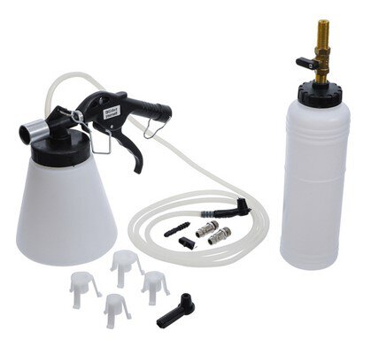 - 1x Entlüftungseinheit mit Pistolengriff - 4x Adapter für Ausgleichsbehälter - 2x Druckluftanschlussnippel - 1x Entlüftungsadapter - 1x Schlauch, transparent - 1x Ersatz-Ventilhebel - 1x Nachfüllflasche zum Aufsetzen auf den Ausgleichsbehälter