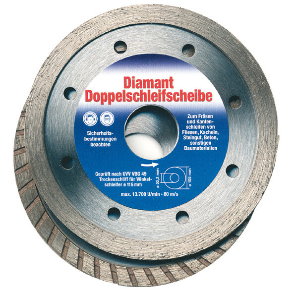 als Frässcheibe zum Ausfräsen von Mörtelfugen und Leitungskanälen, als Schleifscheibe zum Entkanten und Entgraten, auf der groben Seite für Beton, Granit usw, auf der feinen Seite für Fliesen, Kacheln und Steingut