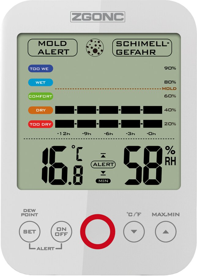 Taupunkt, Alarmfunktion bei Schimmelgefahr, einstellbarer Luftfeuchtigkeitsalarm mit Ober- und Untergrenze