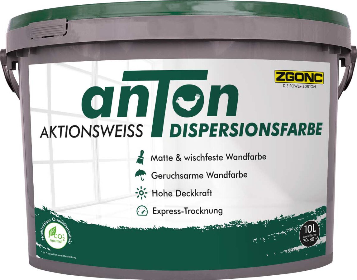 anTon Dispersionsfarbe, matte Wand und Deckenfarbe für innen. Hellweiß, gute Deckkraft, bis zu 100% Spritzfrei. Expresstrocknung 2-4h, leichte Verarbeitung beim Streichen und Rollen. CO2 neutrale Produktion. Reichweite 60-70m2.
