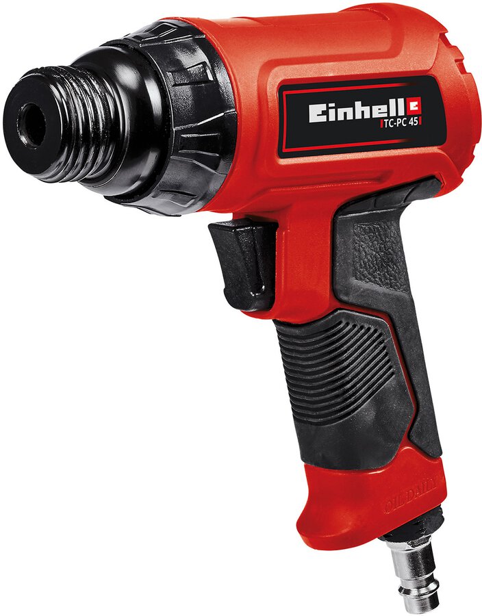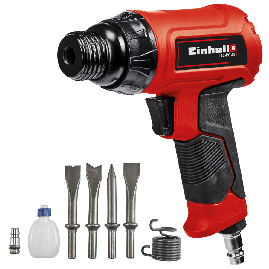 Der Einhell Druckluft-Meißelhammer TC-PC 45 ist ein kraftvoller und ausdauernder Assistent bei Renovierungs- und Abbrucharbeiten rund um Haus und Garten, egal ob Stein oder Metall als Material in Angriff genommen werden müssen. Für ein sicheres Arbeiten ist ein rutschfester gummierter Griff vorhanden, der bedienerfreundlich konzipiert ist. Bei einem maximalen Betriebsdruck von 6,3 bar sorgt das Werkzeug mit einer Schlagzahl von bis zu 4.500min^-1 für eine Schlagstärke von bis zu 1,2 Joule. Die Sechskantaufnahme gewährleistet dabei eine sichere Meißelführung. Beste Performance bietet der robuste Druckluft-Meißelhammer ab einem Schlauchinnendurchmesser von 9 Millimeter. Dank der Vielseitigkeit sind dem Anwender praktisch keine Grenzen beim Einsatz gesetzt. So gehört das vierteilige 120 Millimeter-Meißel-Set für zahlreiche Anwendungen zum Lieferumfang, dazu je ein Ölfläschchen, ein Stecknippel und eine Spannfeder.