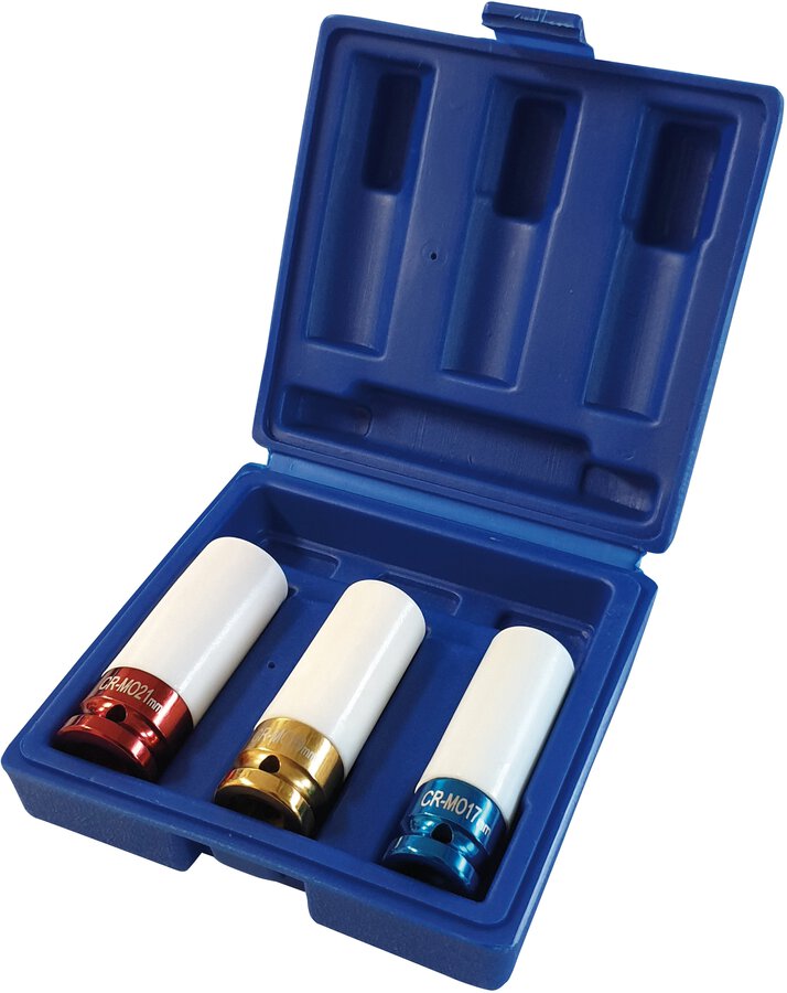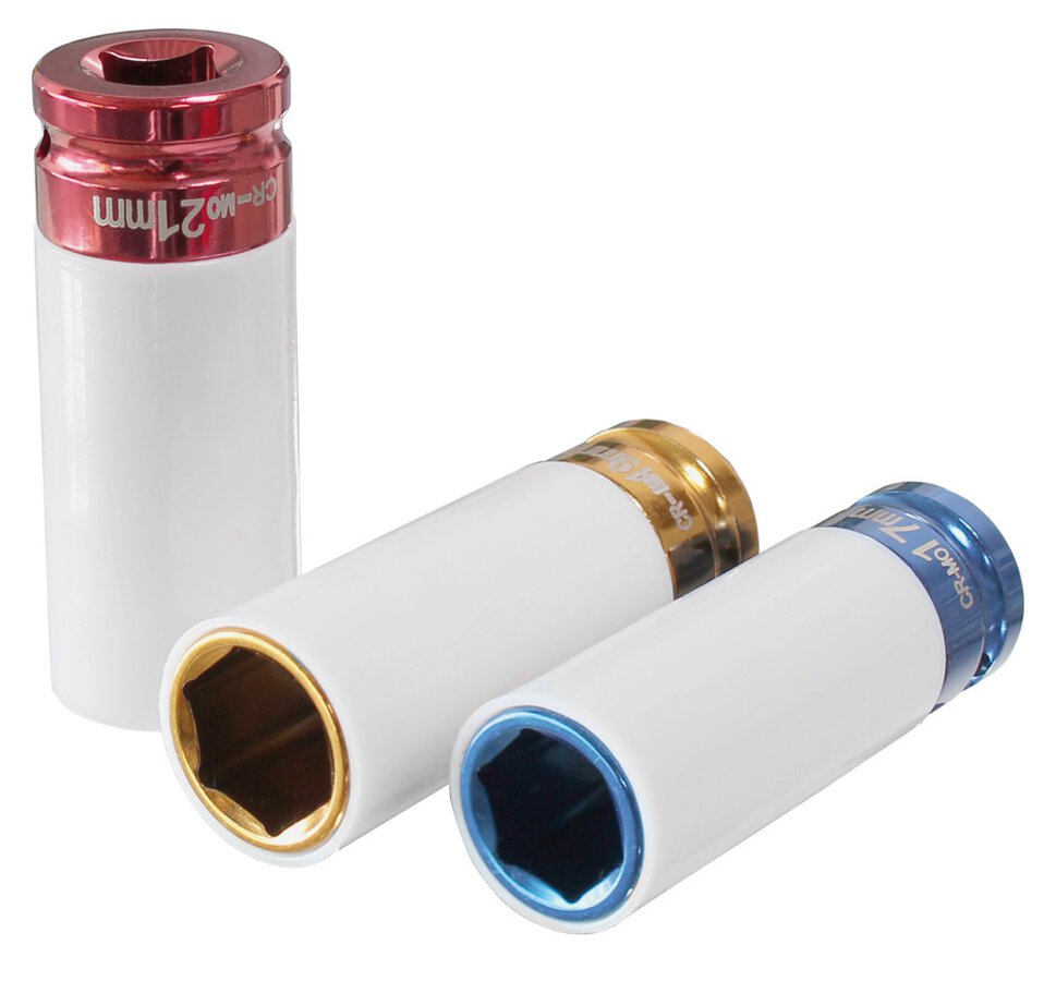 in den Größen: 17, 19 und 21 mm, mit Einbrennlackierung, Kunststoff-Überzug (speziell für Alu-Felgen), Kunststoff-Einsatz innen (verhindert, dass sich Radmuttern nach hinten in die Stecknuss schieben)