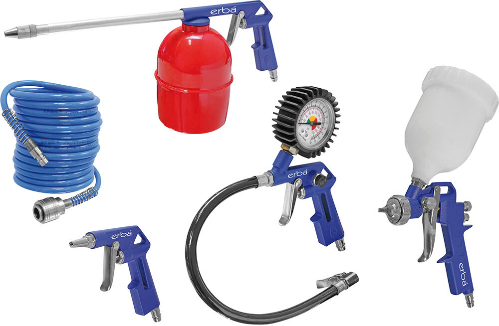 1 Obertopf-Spritzpistole, 600 ml, mit Unterdruckventil, 1 Untertopf-Sprühpistole, 1 Ausblaspistole, 1 Reifenfüller mit Manometer, 5 m Hochdruck-Spiralschlauch