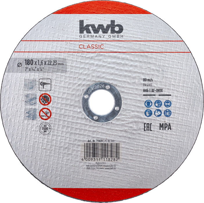 Die kwb Gewebetrennscheibe ist langlebig und überzeugt durch ihren leichten Anschnitt bei geringem Kraftaufwand. Sie ist ideal zum schnellen Trennen von anspruchsvollen Materialien, wie Edelstahl, Stahl, Stahlrohre und Blech. Dank der MPA-Zertifizierung erfüllt sie höchste deutsche und europäische Qualitäts- und Sicherheitsstandards und ist für den markenunabhängigen Einsatz in Winkelschleifern mit einer Umfangsgeschwindigkeit von 80 m/s geeignet.