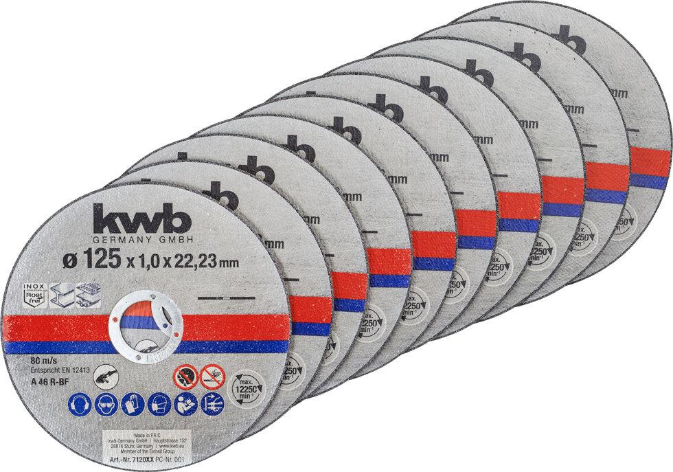 Mit den kwb Dünntrennscheiben 125 mm lassen sich Edelstahl, Aluminium und weitere rostfreie Metalle präzise und professionell bearbeiten. Nur 1 mm dick, überzeugen die schlanken Trennscheiben dennoch mit der gewohnt hohen kwb-Qualität: Sie sind scharf, robust und besonders langlebig. Der Arbeitsvorteil: Die Trennscheibe für Metall schneidet Bleche, Rohre und Profile schnell und extrem sauber – denn das extradünne Maß reduziert Nacharbeiten auf ein Minimum. Die Trennscheiben für Edelstahl und Co. passen auf jeden handelsüblichen Winkelschleifer mit Standardaufnahmebohrung von 22,23 mm. Das 10-teilige Trennscheiben-Set wird geliefert in einer schlanken Aufbewahrungsdose. Exklusiv beim Werkzeugzubehörprofi: Jedem Set kwb Dünntrennscheiben 125 mm liegt ein Paar Gehörschutzstöpsel bei