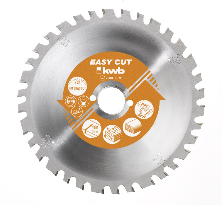 Das kwb EASY-CUT Kreissägeblatt für die Vielzweck-Anwendung ist hartmetallbestückt und verfügt über eine spezielle Wechsel-Zahnstellung mit asymmetrischer Zahnteilung. Die asymmetrische Zahnteilung reduziert die Lärm-Emission beim Sägen um 30 %. Wenige Rückstöße ermöglichen ein vibrationsfreies, gelenkschonendes Arbeiten. Das Blatt ist ideal für Spanplatten, beschichtete Spanplatten, Bauholz, Buntmetall, Blech, Alu-Profile, Kunststoff und Plexiglas sowie Holz mit Metallresten geeignet.