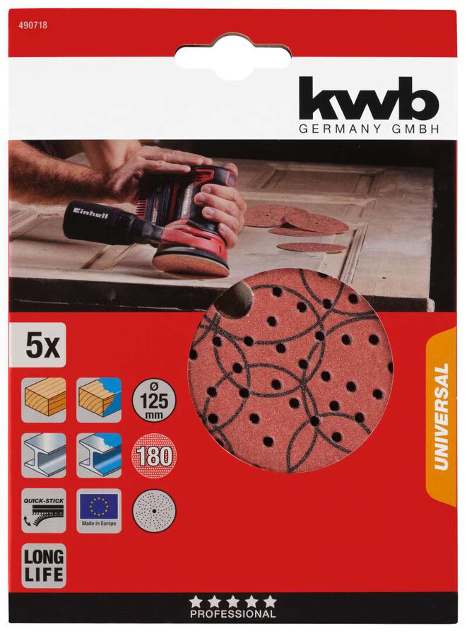 Das 5er-Set Exzenterschleifer-Schleifpapierscheiben gehört in jede Heim- und Handwerkerausstattung. Die Schleifpapierscheiben sind Korund-Aluminiumoxid bestreut und mit einem Vlies-Kletthaftsystem versehen. Durch die universelle Lochung der Schleifpapierscheiben passen diese auf die verschiedensten Exzenterschleifer für 125-mm Scheibendurchmesser. Mit den verfügbaren Körnungen von 40, 60, 80, 120, 180 und 240 werden alle Schleifarbeiten auf Holz, lackiertem Holz, Metall, lackiertem Metall, glasfaserverstärktem Kunststoff, ABS-Kunststoff und Leder abgedeckt. Die Schleifpapierscheiben eignen sich hervorragend zum Entfernen von Rost, Ablösen von Farben, Entgraten und Schleifen von Lötpunkten. Die große Anzahl der kleinen Löcher auf der Gesamtfläche der Schleifpapierscheiben bewirken eine optimierte Absaugung des Schleifstaubs. Die antistatische Beschichtung verhindert das Festsetzen des Schleifstaubs und somit ein Verstopfen an der Lochung der Schleifpapierscheiben, wodurch diese langlebiger werden.