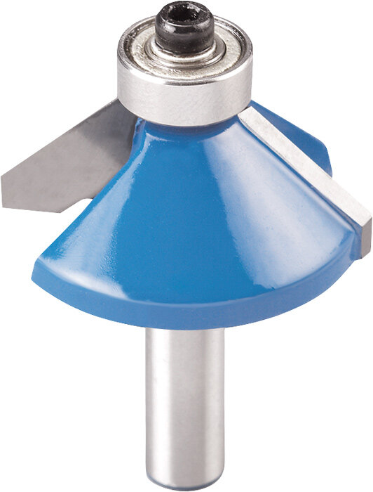 Der 2-schneidige kwb Fasenfräser verfügt über eine hartmetallbestückte präzisionsgeschliffene Schneide. Der Fräser ist für alle handelsüblichen handgeführten Oberfräsen zum Anfasen von Kanten an regelmäßigen oder geschweiften Werkstücken in Hartholz, Weichholz und Plattenwerkstoffen geeignet.