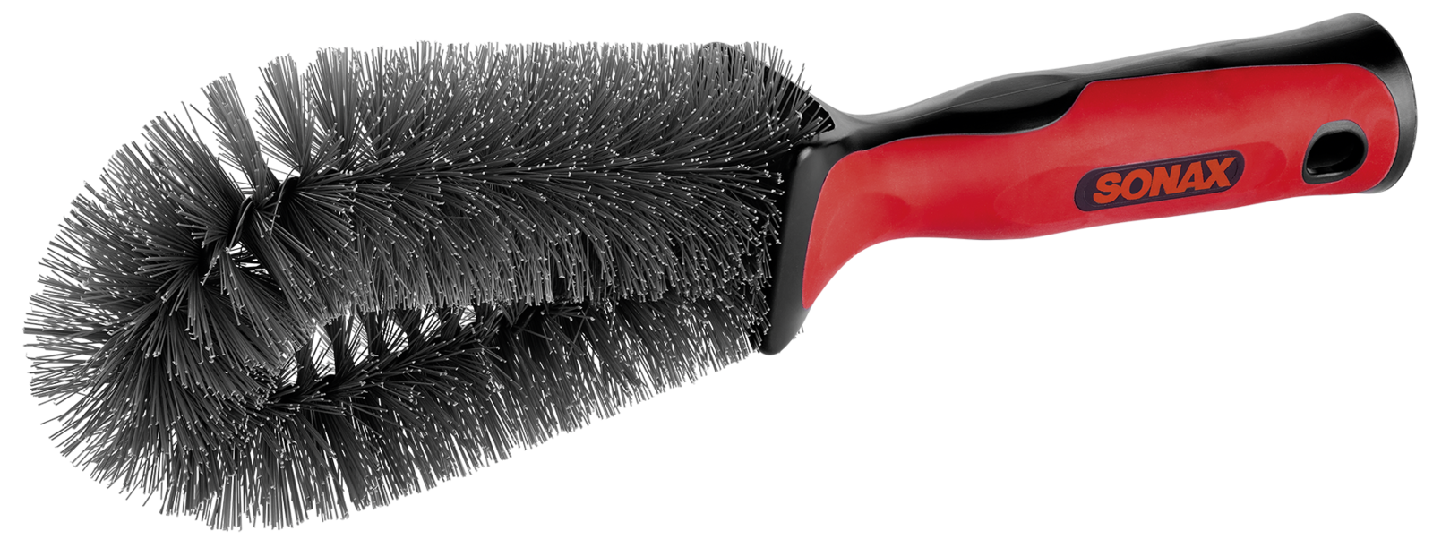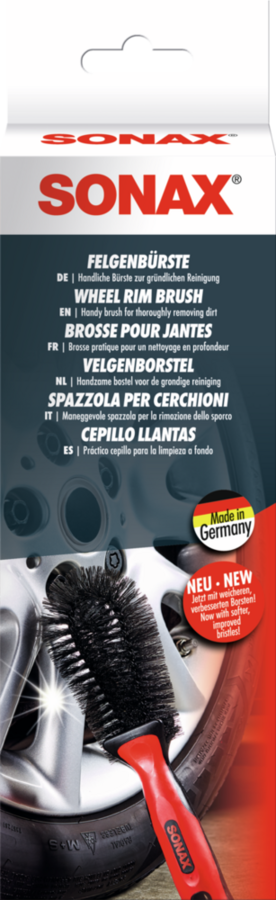 Ergonomische Bürste zur Reinigung von Felgen Reinigungsbürste zum Lösen von hartnäckigen und schwer zugänglichen Verschmutzungen Geeignet für Stahl- und Alufelgen Schont die Felgenoberfläche durch weiche Borsten und einen ummantelten Draht Handlicher und rutschfester Griff für einen sicheren und angenehmen Halt Kartonverpackung mit seitlichem Sichtfenster und Eurolochung Hergestellt in Deutschland.
