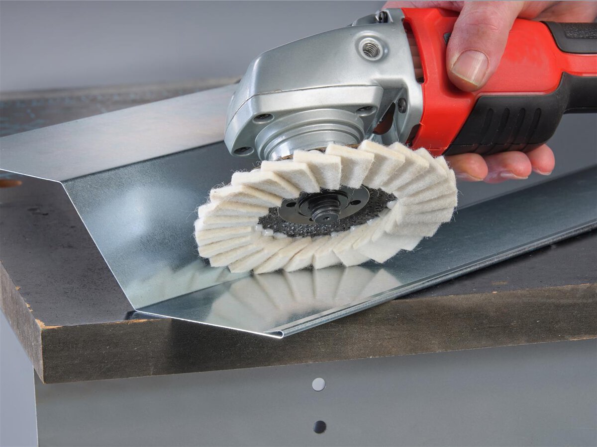 Der Filzpoliermopp für den perfekten Glanz. In Verbindung mit maschinengeeigneter Metallpolitur bringt der Filzpoliermopp Stahl und Aluminium auf Hochglanz. Der einfache Einsatz mit einem handelsüblichen Winkelschleifer macht die Anwendung einfach.