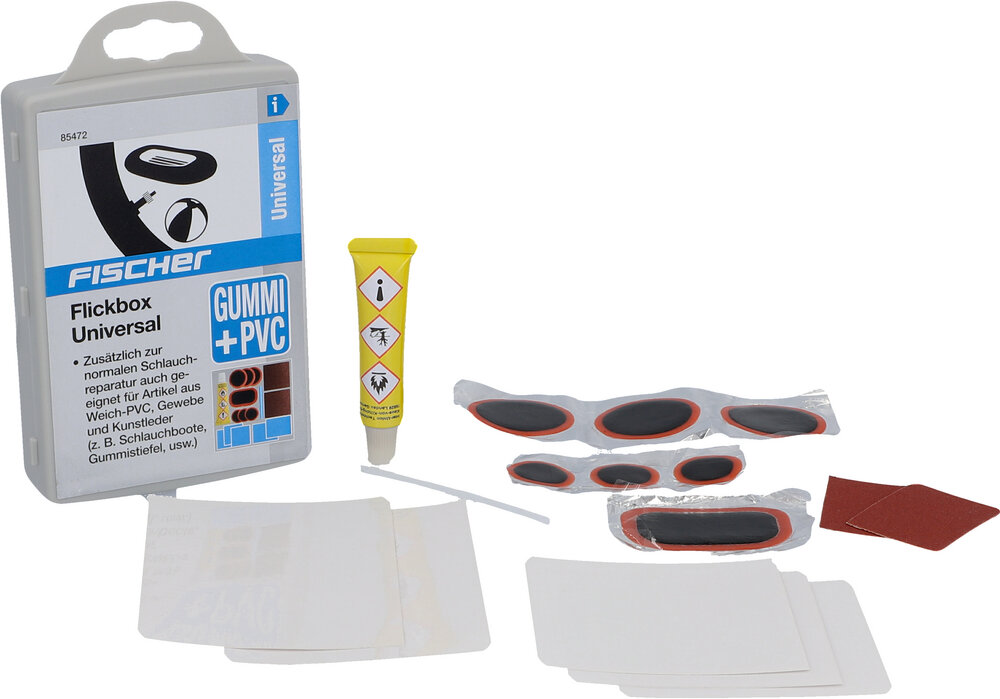 Mit dem Fahrrad-Flickset von FISCHER sind schnelle Instandsetzungen an Reifen und anderen Gegenständen aus Gummi möglich. Insgesamt besteht das Set aus 16 Teilen. Dazu gehören 12 Flicken in verschiedenen Größen und Formen. Es sind ovale, kleine, quadratische und rechteckige Flicken vorhanden. Somit gibt es Optionen für unterschiedliche Beschädigungen und verschiedene Reifengrößen. Die Flicken des Reparatursets sind sowohl für normale Fahrradschläuche als auch für Rennradschläuche geeignet. Darüber hinaus lassen sich mit dem Fahrrad-Flickset von FISCHER auch Gummistiefel, Schlauchboote, Luftmatratzen, Wasserbälle und andere Gegenstände, die aus Weich-PVC, Gummi oder Kunstleder hergestellt sind, reparieren. Weiterhin gehören zu dem Set 2 Blätter Schleifpapier, eine Vulkanisierlösung und Auftragehilfen. Damit lassen sich Instandsetzungen ohne weitere Hilfsmittel ausführen. Eine Anleitung, die präzise die Arbeitsschritte bei der Reparatur vorgibt, ist ebenfalls Teil des Flicksets von FISCHER. Konzipiert ist das Set für kleine Löcher in Fahrradreifen und ähnlichen Objekten. Das Reparaturset ist auf den mobilen Einsatz ausgelegt. Innerhalb von nur wenigen Minuten lässt sich an jedem Ort ein platter Reifen reparieren, sodass die Fahrt fortgesetzt werden kann. Zudem befindet sich das Flickset in einer kompakten und stabilen Kunststoffbox, die sich platzsparend überall verstauen lässt. Insgesamt wiegt das Fahrrad-Flickset von FISCHER inklusive der Transportbox nur 640 g. Dank dieser Eigenschaften ist das Set ein guter Begleiter auf Reisen und Fahrradtouren.