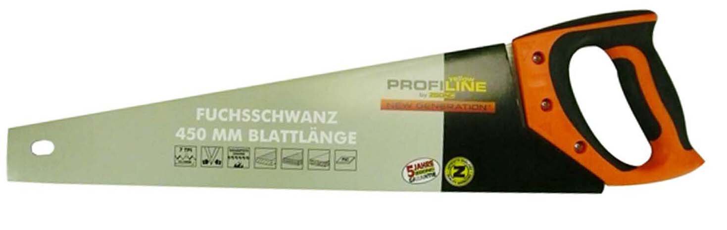 2-seitig geschliffenes Sägeblatt aus Manganstahl, hochfrequenzgehärtet und poliert, 2-Komponenten-Handgriff (ABS + TPR) mit 45°- und 90°-Stop-Winkel, komplett mit transparentem Kunststoff-Zahnschutz