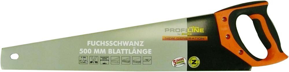 2-seitig geschliffenes Sägeblatt aus Manganstahl, hochfrequenzgehärtet und poliert, 2-Komponenten-Handgriff (ABS + TPR) mit 45°- und 90°-Stop-Winkel, komplett mit transparentem Kunststoff-Zahnschutz