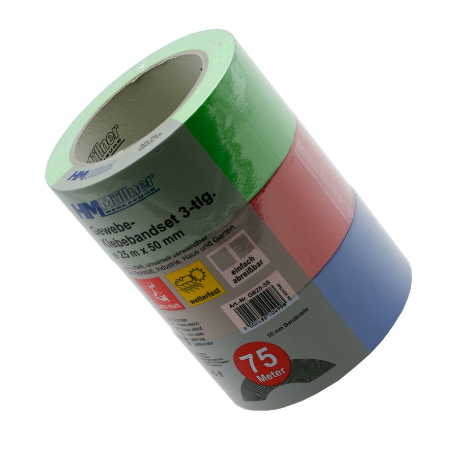 Gewebe-Klebebandset 3-tlg., 25 m, hochwertiges Klebeband mit Netzverstärkung vielseitig einsetzbar in verschiedener Kennzeichnungsfarbe extrem robust und reißfest, jedoch einfach per Hand einreißbar dauerhaft haltbar Bandlänge 25 m je Farbe Bandbreite 50 mm