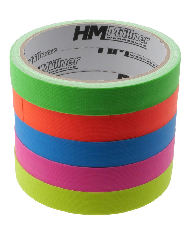 Neon-Klebe-/Markierband-Set, 5-tlg. hochwertiges, universell einsetzbares UV-aktives Gewebe-Klebeband ideal für gut sichtbare Farbcodierung, Markierung, Kennzeichnung und Bündelung praktisch auch für sichtbares Befestigen sowie Dekorationszwecke von Hand einreißbar wasserbeständig gute Klebekraft und Reißkraft leicht und rückstandsfrei entfernbar einfach zu beschriften durch PE-Beschichtung Länge je 5 Meter, Breite 15 mm bestehend aus je 1 Stück, Länge 5 m, in Neonfarbe grün, orange, blau, pink und gelb