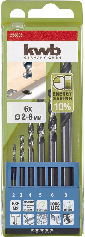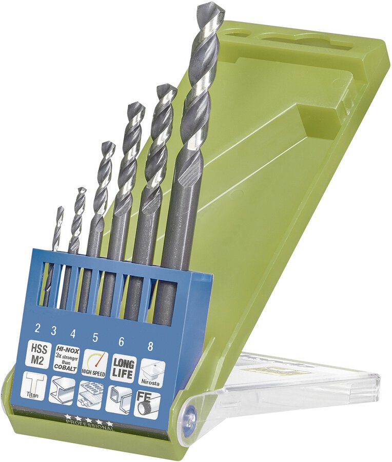 präzise verarbeiteter Bohr-Satz mit hoher Wärmebeständigkeit für optimales Schneideverhalten , spezieller Spitzanschliff (130° Spitzwinkel) , extrem hochwertig geschliffene, extra harte HSS-Stahlbohrer, Inhalt: je 1 x 2, 3, 4, 5, 6, 8 mm Ø