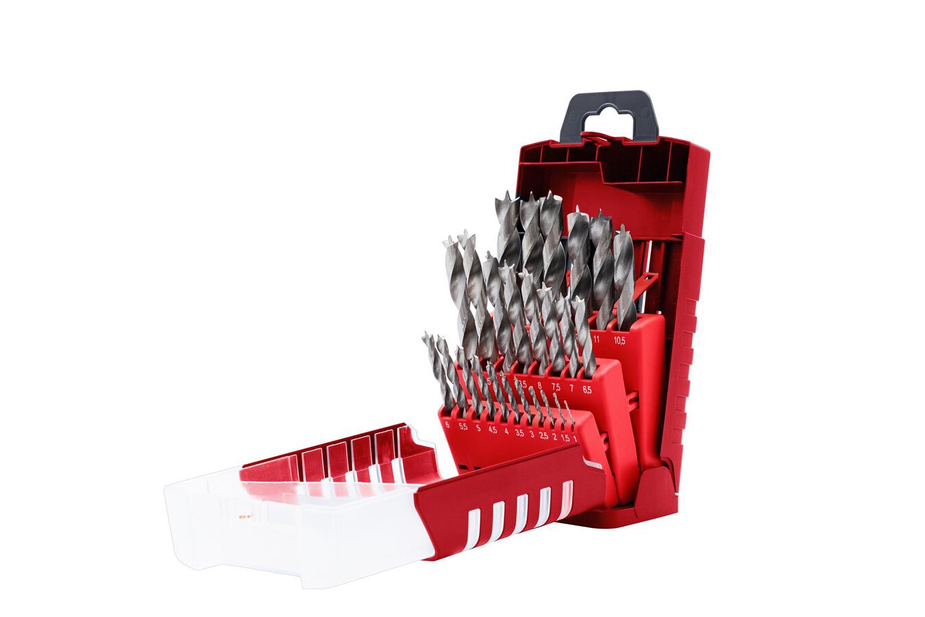 Für punktgenaue Bohrungen ohne Verlaufen des Bohrers beim Anbohren sind die Holzbohrer-Sets in der praktischen Kassette ideal für jeden Heimwerker. Das 25-teilige Holzbohrer-Set besteht aus Bohrern in den Durchmessern von 1 mm bis 13 mm in 0,5-mm-Schritten. Die Bohrer sind perfekt für sauberes Bohren in Weich- und Hartholz, verleimten Hölzern, MDF, Kunststoff und Acrylglas. Die Zentrierspitze sorgt für punktgenaues Anbohren. Die Vorschneider ermöglichen kreisrunde Bohrungen mit sauberen Lochrändern. Ein Ausfransen der Bohrränder gehört der Vergangenheit an. Die Bohrer sind unter anderem geeignet zum Herstellen von Verbindungen mit eingeleimten Holzdübeln.