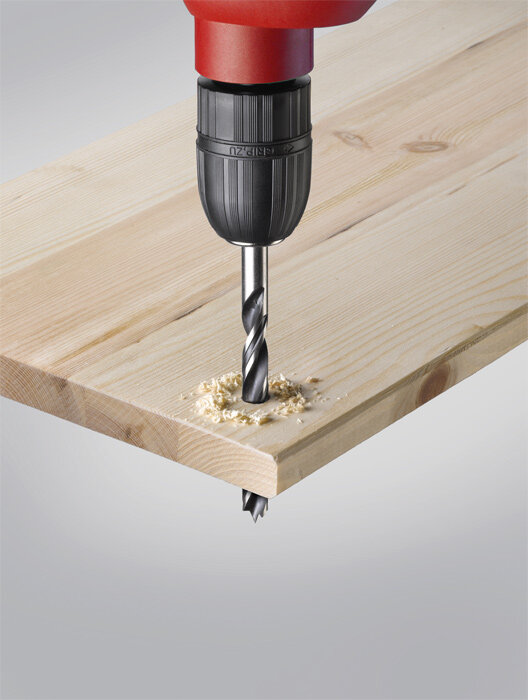 Holzspiralbohrer, CV-Stahl, spanlos geformt, 2-Fasen Spiralform, für stabilen Geradeauslauf, Farbe schwarz, blankgeschliffene Spiralen, mit Zentrierspitze und Schulterschneider, für präzise ausrissfreie Bohrungen, Schaft zylindrisch, Industriequalität, für Weich- und Hartholz.