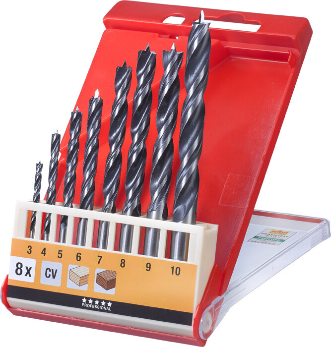 Der 8-teilige Holzbohrersatz beinhaltet den zylindrischen kwb Holzspiralbohrer aus CV-Stahl. Der Bohrer ist spanlos geformt und hat eine 2-Fasen Spiralform für den stabilen Geradeauslauf. Der schwarz-farbige Holzbohrer mit blankgeschliffene Spiralen verfügt über eine Zentrierspitze und zwei Schulterschneider für präzise und ausrissfreie Bohrungen. Der Spiralbohrer in Industriequalität ist ideal für Weichholz und Hartholz geeignet.