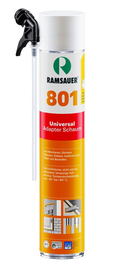 Die hervorragende Haftung auf vielen Materialien und ausgezeichnete Dämmwerte machen unseren 801 Universal Adapter Schaum zum Allrounder, wenn es um das Isolieren und Füllen von Fugen und Hohlräumen geht. Die anwenderfreundliche Dose mit Röhrchen ermöglicht ein sauberes und kontrolliertes Arbeiten. Der einkomponentige PU-Schaum zeichnet sich durch die überwiegend geschlossenzellige Beschaffenheit aus und härtet durch die Luftfeuchtigkeit aus. Nach dem Aushärten ist er halbhart, verrottungsfest, feuchtigkeitsbeständig und hält Temperaturen zwischen -40° C und +80 °C stand. Dadurch kann er bei auch für Fugen von Außentürenzargen verwendet werden.