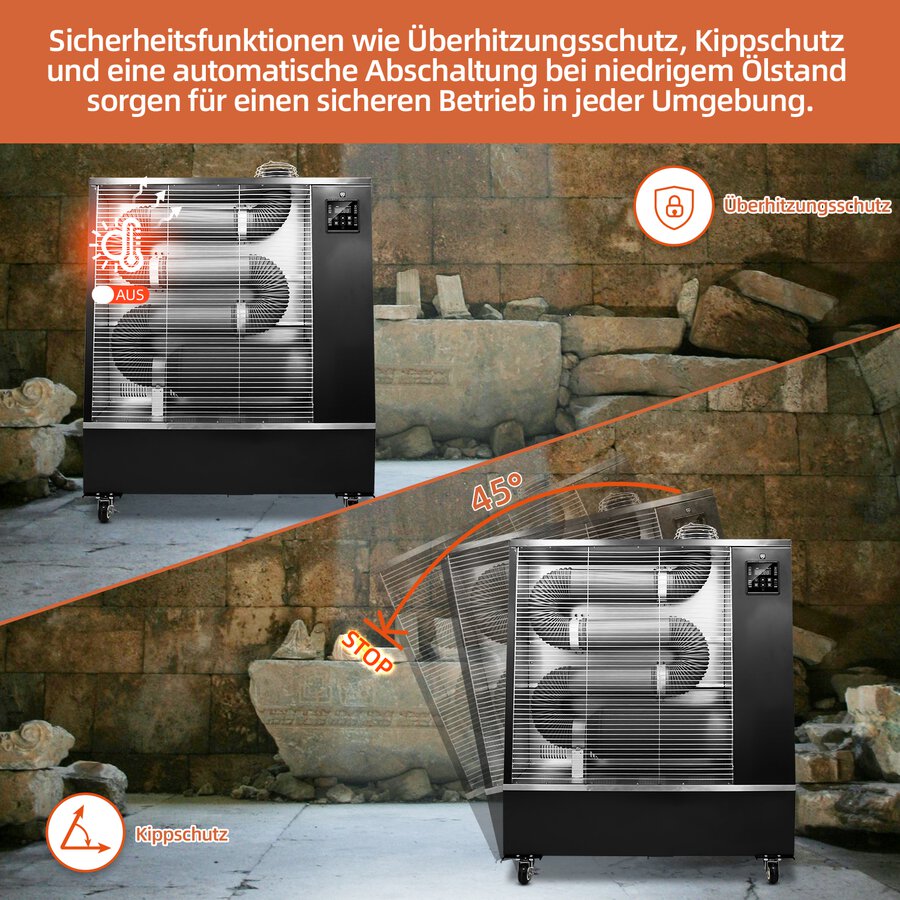 Sicherheitsfunktionen wie der 45°-Kippschutz, die Flammenausfallschutzvorrichtung, der Alarm bei niedrigem Ölstand am Boden und der Überhitzungsschutz gewährleisten einen sicheren Betrieb.
