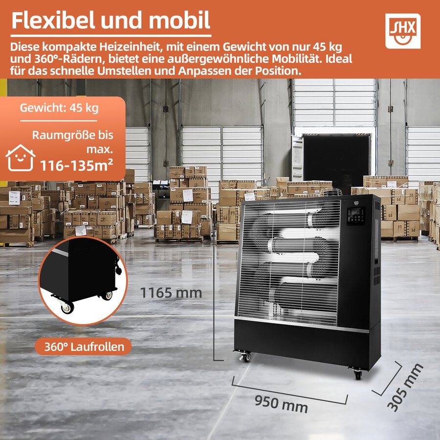 Mit einem schlanken und kompakten Design sowie einer einzigartigen Struktur passen sie sich nahtlos verschiedenen Umgebungen an. Diese Heizgeräte verfügen über einen leistungsstarken Heizkörper mit breiter Strahlung, der einen Bereich von bis zu 120 Quadratmetern abdeckt. Die Bedienung erfolgt einfach über das LED-Display mit Touchpad und Fernbedienung, und die Beweglichkeit wird durch 360°-Räder ermöglicht.