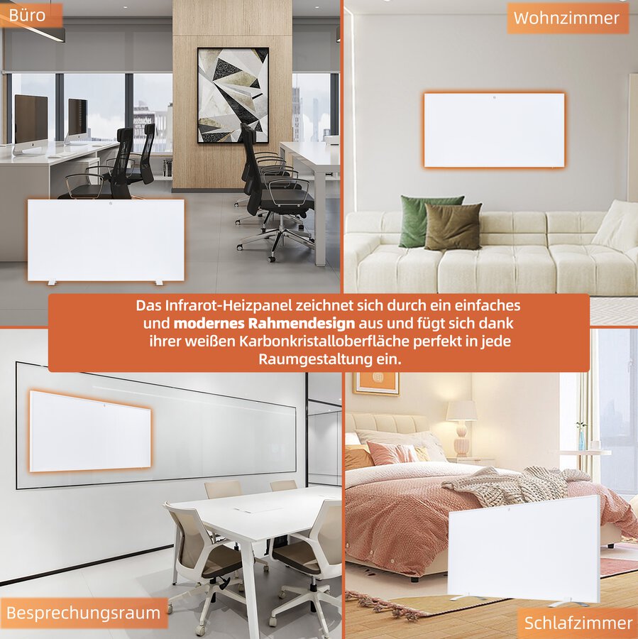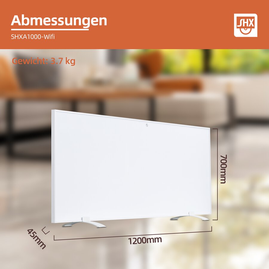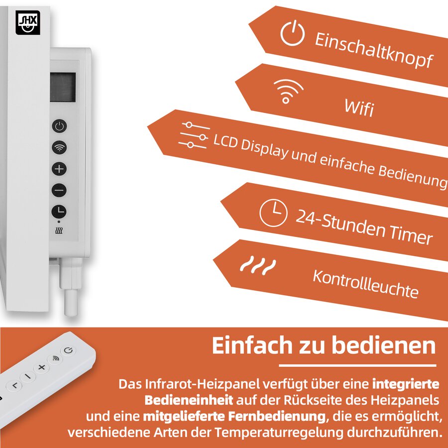 Die SHXA-Serie mit bestem Preis-/Leistungs-Verhältnis ist eine gerahmte Infrarot-Heizplatte mit eingebautem Temperaturregler. Die Heizplatte hat ein einfaches und modernes Rahmendesign und passt zusammen mit der weißen Carbon-Kristalloberfläche für alle Arten von Raumausstattungen. Das Paneel verfügt über eine eingebaute Steuerbox auf der Rückseite des Bedienfelds, mit der Sie verschiedene Arten von Temperaturregelungen durchführen können. Im manuellen Modus können Sie die Temperatureinstellung sowie den 24-Stunden-Timer bedienen, während Sie mit einer App komplexe Heizplaneinstellungen vornehmen können.