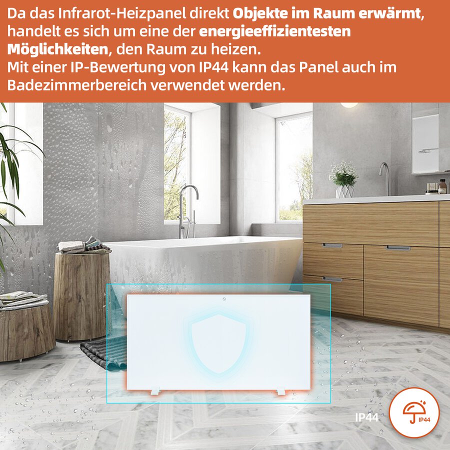 Aufgrund der Tatsache, dass die Infraroterwärmung Objekte im Raum direkt erwärmt, ist dies eine der energieeffizientesten Möglichkeiten, Ihren Raum zu heizen. Mit der IP-Klasse von IP44 kann es ebenfalls im Badezimmerbereich verwendet werden.