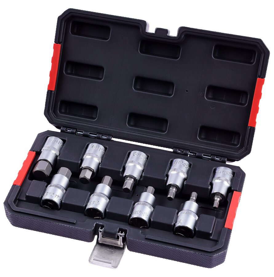 Innensechskanteinsatz-Kassette, 9-tlg., Werkzeuge aus Chrom-Vanadium-Stahl, satiniert, 1/2“-Vierkantantrieb, Einsätze SW5/SW6/SW7/SW8/SW9/SW10/SW12/SW14/SW17