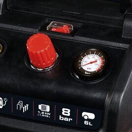 Der Einhell Kompressor TC-AC 190/6/8 OF ist ein echter Allrounder bei den vielfältigen Aufgaben im Haus, der Werkstatt und Garage. Mit den passenden Tools kann der Kompressor bei zahlreichen Anwendungen eingesetzt werden: vom Lackieren über das Ölen bis hin zu Ausblas- und Reinigungsarbeiten. Im Handumdrehen sind Reifen, Bälle und Matratzen mit Luft gefüllt. Der kraftvolle Motor arbeitet mit starken 1,2 kW, einer Motordrehzahl von 18.000 Umdrehungen pro Minute und benötigt nur einen geringen Wartungsaufwand. Die integrierte, ölfreie Pumpe erzeugt bis zu 8 bar Betriebsdruck bei einer Ansaugleistung von 190 Litern pro Minute und einer Pumpendrehzahl von bis zu 3.800 Umdrehungen pro Minute. Der mobile Kompressor ist mit einem 6 Liter fassenden Drucklufttank ausgestattet, der ein ausdauerndes Arbeiten erlaubt. Praktisch ist die Kabelaufwicklung an der Rückseite des Gehäuses. Haken und Aufbewahrungsfach für optionales Zubehör sind im Gehäuse integriert. Dank des bis zu 8 bar regulierbaren Druckminderers kann der Kompressor eine Vielzahl von Anwendungen erledigen. Manometer und Schnellkupplung für den geregelten Arbeitsdruck sind vorhanden. Für einen sicheren Stand während des Betriebes sorgen die Standfüße. Der Anwendersicherheit dient das Sicherheitsventil. Die Entwässerungsschraube erlaubt eine komfortable Wartung. Gegen die Durchrostung des Kessels gewährt Einhell zehn Jahre Garantie.