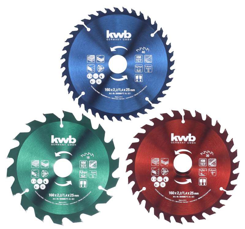 Von Grund auf clever ausgestattet! Diese 3-teiligen Kreissägeblattsätze sind die ideale Grundausstattung für die Kreissäge. Jedes Set enthält jeweils ein Sägeblatt für eine feine, eines für eine mittlere und eines für eine grobe Schnittgüte. Besonders praktisch: Alle Blätter sind unterschiedlich eingefärbt – so ist die Schnittgüte jedes Blattes auf einen Blick erkennbar. So unterschiedlich die Farbgebung, so gleich die Leistungsfähigkeit: Alle Blätter der Sets haben Hartmetallzähne, die für besondere Robustheit und Langlebigkeit sorgen. Die Zähne weisen eine positive Zahnstellung auf und arbeiten sich damit zuverlässig durch diverse Materialien. Die Wechselzahnstellung ermöglicht das Schneiden in Längs- und Querrichtung, was das Arbeiten mit den Sägeblättern vereinfacht. Alle Sets enthalten Reduzierringe. Zu jedem 3-teiligen Kreissägeblattsatz gehört ein praktischer Kunststofftray, in dem die Kreissägeblätter sicher aufbewahrt werden können. Er bietet außerdem weiteren Platz für bereits vorhandene Sägeblätter. Die Kreissägeblätter dieser Sets können verwendet werden mit den gängigen Handkreissägen sowie Kapp- und Gehrungssägen. Anzahl Zähne: 18, 30, 40