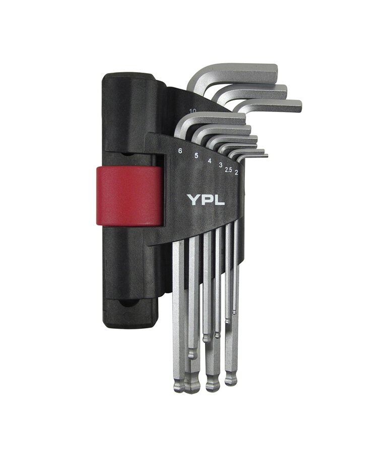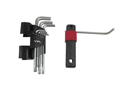 Inhalt: 9 Innensechskantschlüssel: 2 / 2,5 / 3 / 4 / 5 / 6 / 7 / 8 und 10 mm 1 Zusatzhandgriff 1 Halterung