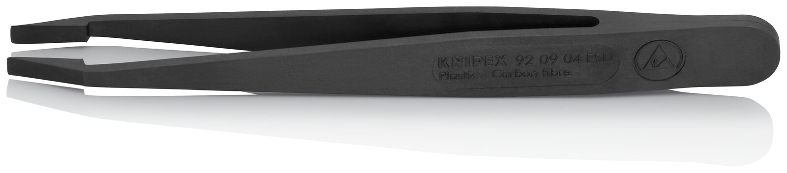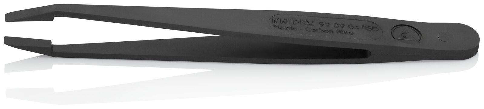 92 09 04 ESD Kunststoffpinzette ESD ESD-Pinzetten bestehen aus 30% kohlenstofffaserverstärktem Kunststoff, sind elektrisch und thermisch sehr gut leitfähig und zeichnen sich durch einen hohen Abriebwiderstand und Kratzsicherheit aus. Mit einem Oberflächenwiderstand zwischen 10^2 - 10^4 Ohm zum kontrollierten Ausgleich von Potenzialunterschieden zwischen Bediener und elektronischen Bauteilen. ESD-Kunststoffpinzetten sind temperaturstabil bis 130° Grad Celsius, kurzfristig bis 190° Grad sind möglich. Der kohlenstofffaserverstärkte Kunststoff der ESD-Varianten ist vollelastisch, ermüdungsbeständig, vibrationsdämpfend und wasserabweisend, mit guter chemischer Beständigkeit gegenüber den meisten Ölen, Fette, Kraftstoffen und unpolaren Lösungsmitteln. ESD-Kunststoffpinzetten eignen sich optimal für maximal oberflächenschonende Arbeiten an empfindlichen elektronischen Komponenten, mikro-mechanischen sowie Glas- und Keramikbauteilen. ESD-Kunststoffpinzetten: auch im Set erhältlich (92 00 05 ESD). - Oberfläche: Mattiert - Ausführung: Gerade - Spitzenbreite (A): 0,12mm - Spitzenbreite (B): 3,3mm - Spitzenbreite (C): 11,5mm - Ausführung Pinzettenspitze: Stumpf - Korrosionsbeständig: ja - Säurebeständigkeit: Sehr gut - ESD-geprüft: ja - VDE-geprüft: nein - Branchen: Elektronik - Magnetisch: Nicht magnetisierbar (100%) - Verhalten: ableitend