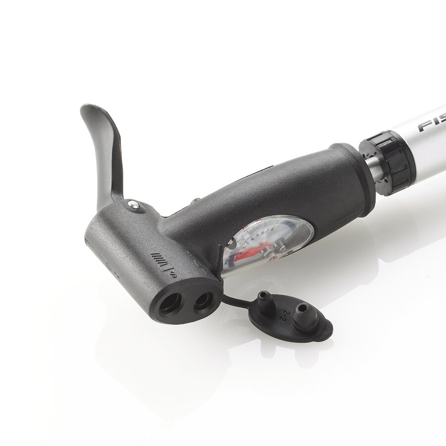 Die FISCHER Mini-Luftpumpe mit Manometer ist ein kompakter und zuverlässiger Begleiter. Da sie aus Aluminium gefertigt ist, ist die Fahrradpumpe leicht zu transportieren. Durch die kompakten Abmessungen passt sie auch in kleinere Taschen und kann mit ihren 24,5 cm Länge überall mittransportiert werden. Der ergonomisch geformte 2-Komponentengriff sorgt dafür, dass Gegenstände bequem und sicher aufgepumpt werden können. Mit dem angebrachten hochpräzisen Manometer lässt sich der Luftdruck immer im Blick behalten. Das große Display bietet eine Skala bis 8 bar. Somit kann jeder Gegenstand exakt mit der empfohlenen Menge Luft befüllt werden. Ein verbauter Duokopf an der FISCHER Mini-Pumpe bietet sich für einen variablen Einsatz an. Die Fahrradpumpe ist somit für ein Auto-Ventil (AV), Dunlop-Ventil (DV) und Sclaverand-Ventil (SV) geeignet. Damit können beispielsweise Autoreifen, Rollstuhlreifen, Fahrradreifen, Mountainbike-Reifen oder Motorradreifen problemlos aufgepumpt werden. Die Doppelhub-Technik der Fahrradpumpe bewirkt, dass das Aufpumpen leicht und effektiv von der Hand geht, indem sowohl beim Drücken als auch beim Ziehen Luft in den Gegenstand gepresst wird. Mit dem Schnellverschluss der Fahrradpumpe wird das Ventil exakt fixiert und die Pumpe ist sofort einsatzbereit. Der Verschluss hält zudem die Pumpe stabil zusammen. FISCHER steht für Tradition und Qualität auf dem Gebiet des Fahrradzubehörs. Jahrelange Erfahrung in der Produktentwicklung und Produktion führten zu technischen Innovationen und durchdachten Services.